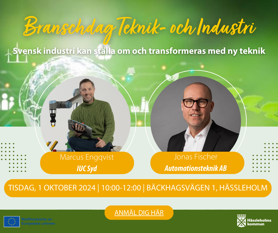 Under förmiddagen kommer ni få information och inspiration om vilka möjligheter och stöd som erbjuds till företag inom teknik- och industribranschen, som kan underlätta teknikskiften inom ert företag. Marcus Engqvist, IUC Syd (Industriellt utvecklingscentrum) Lyssna på Marcus som har en bred erfarenhet om hur det går till att sätta en plan och genomföra förändringar. Han berättar hur monotona arbetsuppgifter utförs av robotar och hur personalen kan ta till sig ny teknik. Han visar exempel, delar tankar, erfarenheter och talar om fördelarna med att involvera medarbetare tidigt. Jonas Fischer, Automationsteknik AB Jonas kommer göra en företagspresentation- och visning av verksamheten. Automationsteknik utför industriell automation och mekanik med tjänster som sträcker sig från konstruktion, programmering, installation och underhåll inom robotlösningar. Efter dessa presentationer finns det tid för frågor och diskussion. Det kommer bjudas på lättare mat och dryck. När? Tisdagen den 1 oktober kl 10:00-12:00 Var? Automationsteknik AB, Bäckhagsvägen 1, 281 33 Hässleholm Anmäl dig här Kontakt vid frågor: Marielle Drougge Cervin, Näringslivsutvecklare marielle.a.drougge.cervin@hassleholm.seBranschdag i Hässleholm: Teknik och Industri