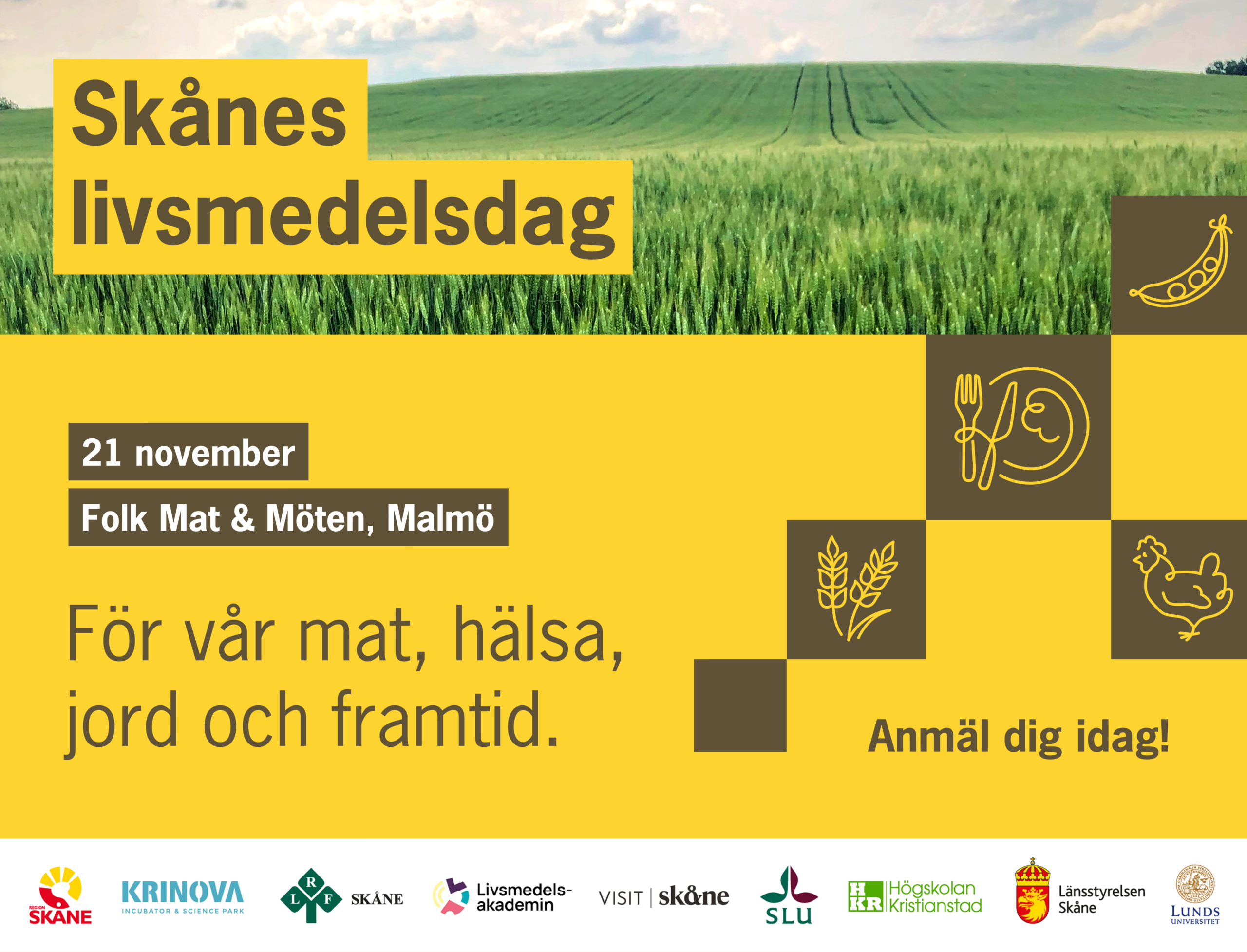 Styrgruppen för Skånes livsmedelsstrategi bjuder in till en heldag med syfte att belysa hur regionens livsmedelssystem ska kunna stärkas, långsiktigt och hållbart. Dagen kommer att innehålla både inspiration och möjligheten att själv påverka framtiden i ett rådslag. Program och anmälan För vem? Målgruppen för dagen är företag i olika storlekar, myndigheter, intresseorganisationer, studenter, kommuner, forsknings- och innovationsaktörer, politiker, med flera. Arrangörer Dagen arrangeras av styrgruppen för Skånes livsmedelsstrategi bestående av: Region Skåne, Livsmedelsakademin, LRF Skåne, Länsstyrelsen, Krinova, SLU, Lunds universitet, Högskolan Kristianstad och Visit Skåne.Skånes livsmedelsdag