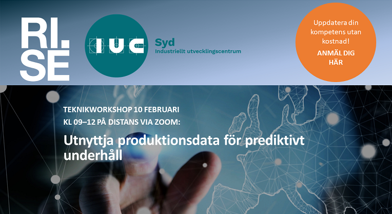 I workshoppen presenteras utgångspunkter för företag som har kommit olika långt på vägen från reaktivt underhåll till digitaliserade, tjänstebaserade och hållbara erbjudanden. NÄR: Torsdagen den 10 februari, kl 09.00 – 12.00 VAR: Via zoom, länk skickas ut innan workshoppen. Mer information, inbjudan och anmälan här Kontakt på IUC Syd: pia.holmberg@iucsyd.seUtnyttja produktionsdata för prediktivt underhåll