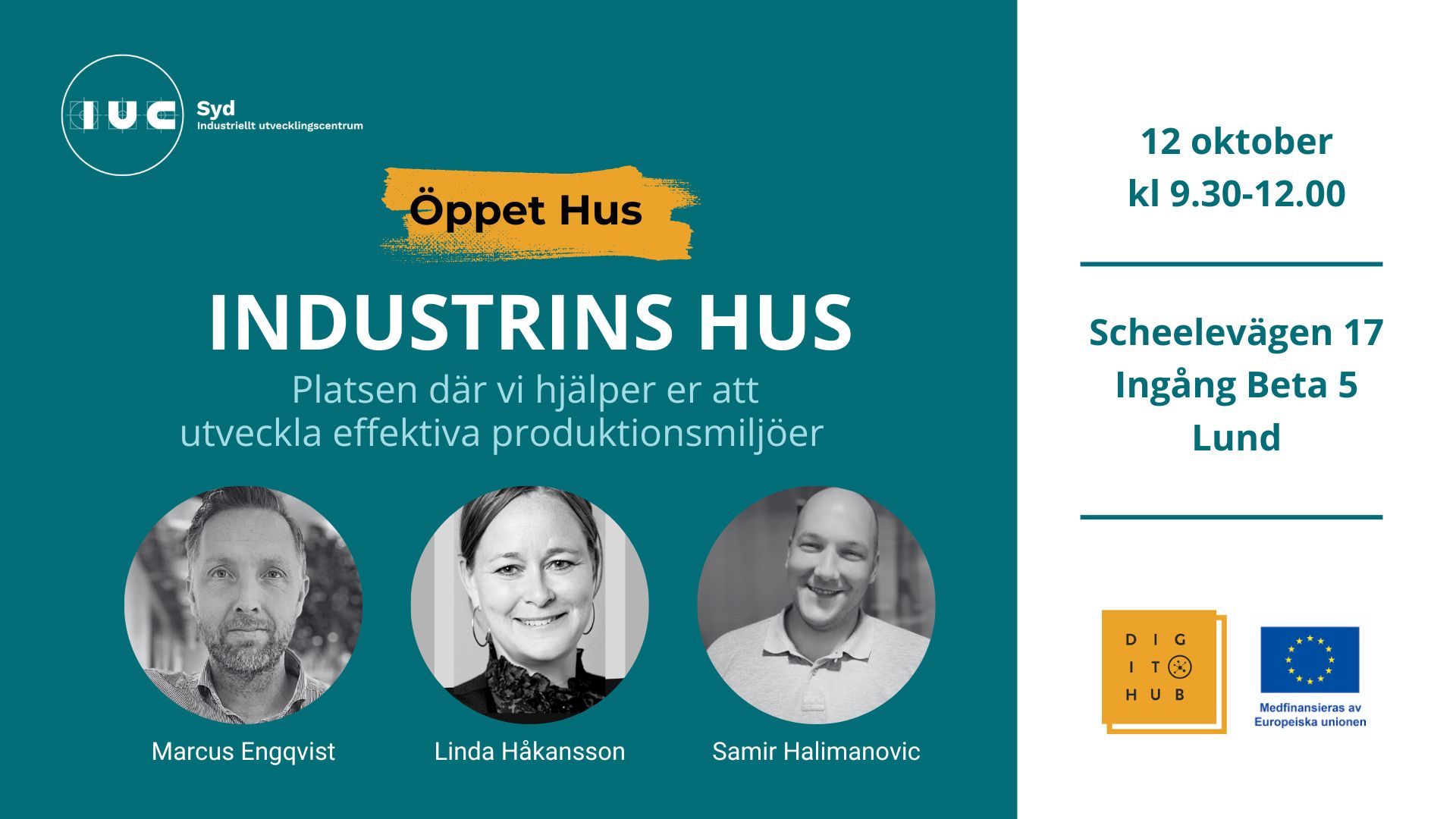 Tillsammans med DigIT Hub bjuder IUC Syd in till Öppet Hus och slår upp dörrarna till vår testmiljö Industrins Hus i Lund. Kom, träffa våra medarbetare på plats och låt er inspireras till att ta nästa steg i er produktionsutveckling med hjälp av test before invest. Mer information om dagen kommer inom kort.